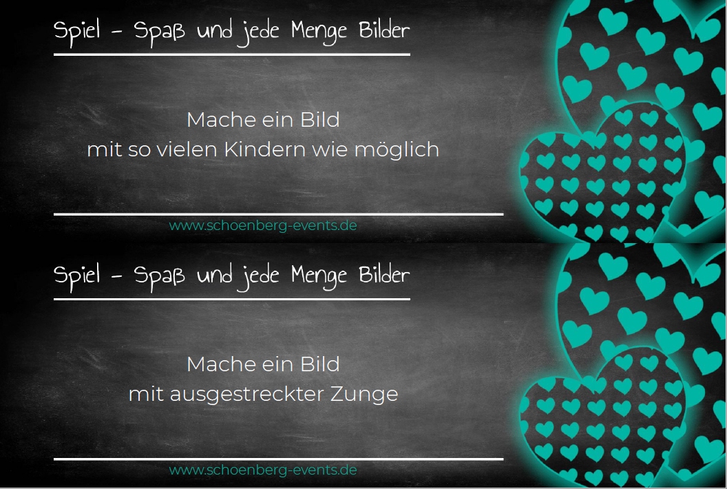 Mit den Photobooth-Aufgaben haben die Gäste noch mehr Spaß und es gelingen noch kreativere Bilder. Zudem sind die Aufgaben gerade bei Hochzeitsfeiern das ultimative Kennlernspiel.